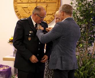 In seiner letzten Amtshandlung als Wehrleiter verlieh Franz-Josef Preis die Floriansnadel an seine Frau Karla. Mit dieser Auszeichnung des Landesfeuerwehrverbandes wird der besondere Rückhalt von Familienangehörigen für die ehrenamtliche Feuerwehrtätigkeit gewürdigt.