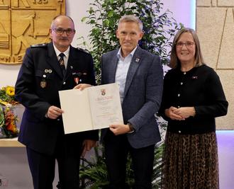 Auch Stefan Sereda als Vertreter des Kreisfeuerwehrverbandes, dessen Vorsitzender Franz-Josef Preis ist, würdigte die Verbandsarbeit die Preis bisher geleistet hat und weiterhin leisten wird. Im Namen des Landesfeuerwehrverbandes verlieh er Preis das Deutsche Feuerwehr-Ehrenkreuz in Gold des deutschen Feuerwehrverbandes.