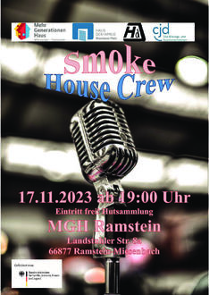 Alle Jahre wieder ... spielt die „Smoke House Crew“ im November im Mehrgenerationenhaus Ramstein. Bei freiem Eintritt (Hutsammlung), Getränken und Würstchen freut sich das MGH-Team auf viele Besucherinnen und Besucher, die den Klängen der "Alt-Rocker" lauschen. Termin ist am Freitag, 17. November, ab 19 Uhr.