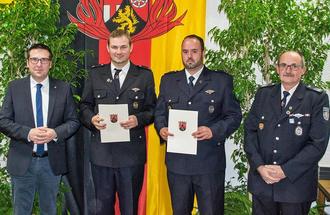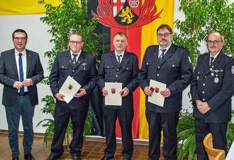 Ehrungen für 25 Jahre aktive Tätigkeit bei der Feuerwehr (v.l.): Marcus Klein (1. Beigeordneter), Daniel Viertel, Daniel Mende und Wehrleiter Franz-Josef Preis (Foto: Frank Schäfer).