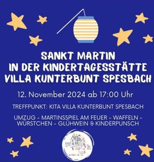 Am Dienstag, den 12.11.2024 feiern die Kinder der Villa Kunterbunt ihr Martinsfest. Dazu laden sie alle Verwandte, Freunde und Bekannte, Groß und klein herzlich ein. Treffpunkt ist um 17 Uhr vor der Kindertagesstätte in Spesbach.