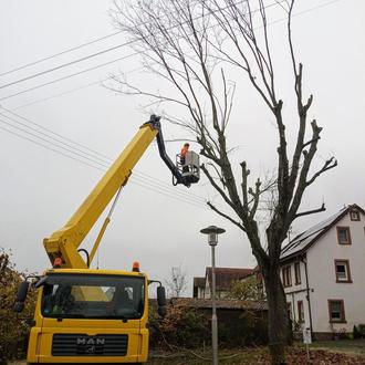 In enger Zusammenarbeit mit einem Baumpfleger wurden auf dem Marktplatz Totholz entfernt und ein Pflegeschnitt an den Bäumen vorgenommen. Während sich die Experten um die Arbeiten im Bereich der Hochspannungsleitungen kümmerten, übernahm der Bauhof der Gemeinde unterstützende Aufgaben und half beim Rückschnitt. Die umfangreichen Arbeiten wurden Hand in Hand professionell und zügig ausgeführt.