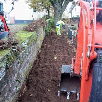 Die Ortsgemeinde Hütschenhausen nutzt die Zeit des Grünschnitts für notwendige Baumpflege und umfangreiche Rückschnitte von Hecken, um die Friedhofsmauern zu erhalten. Der Ortsbeigeordnete Uli Kohl koordiniert die Arbeiten zwischen den Baumpflegern und dem Bauhof der Ortsgemeinde.