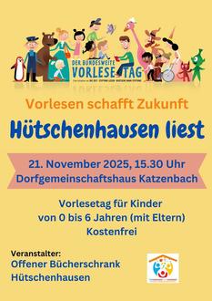 Am Freitag, den 21. November 2025, lädt die Aktion „Hütschenhausen liest“ alle Kinder im Alter von 0 bis 6 Jahren herzlich zu einer besonderen Vorlesestunde ein. Im Rahmen des bundesweiten Vorlesetages der Stiftung Lesen werden im Dorfgemeinschaftshaus Katzenbach (Brunnenstraße 22) spannende, lustige und liebevoll ausgesuchte Geschichten vorgelesen – kindgerecht, lebendig und mit viel Freude an Sprache und Fantasie.