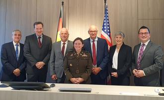 Das Bild zeigt von links nach rechts: R. Peter Masterton, Joerg C. Moddelmog, LL.M. (USA), Bernhard Thurn (Präsident des Pfälzischen Oberlandesgerichts Zweibrücken), Colonel Kathrin S. Gowel, Hans-Peter Freymann (Präsident des Saarländischen Oberlandesgerichts), Maria Stutz (Präsidentin des Landgerichts Zweibrücken), Jan Hornberger (Direktor des Amtsgerichts Landstuhl).