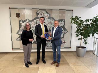 Besuch im Kreishaus: Landrat Ralf Leßmeister und 1. Kreisbeigeordnete Gudrun Heß-Schmidt begrüßten Dr. David Siegel, der seit 1. Oktober Notar mit Amtssitz in Landstuhl ist, und überreichten ihm das Wappen des Landkreises.