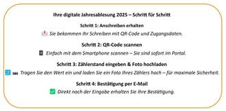 Im Schreiben finden Sie einen QR-Code, der Sie direkt in das Online-Portal führt. Dort ist Ihr Zähler bereits korrekt zugeordnet – Verwechslungen sind ausgeschlossen. Nach Eingabe Ihres Zählerstands erhalten Sie sofort eine Bestätigung per E-Mail.