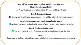 The letter will contain a QR code that will take you directly to the online portal. Your meter will already be correctly assigned there – mix-ups are impossible. After entering your meter reading, you will immediately receive a confirmation email.