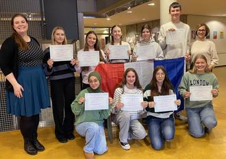Der Fachbereich Französisch freut sich in diesem Jahr erstmalig neun Schülerinnen und Schülern das internationale französische Sprachzertifikat DELF scolaire des Niveaus "A2" überreichen zu dürfen. Schulintern bietet das Reichwald-Gymnasium im Rahmen von "DELF scolaire intégré" den Erwerb des Zertifikats in Klasse 10 seit dem letzten Schuljahr an. Die Prüfung umfasst neben Hör- und Leseverstehen auch Textproduktion sowie eine mündliche Prüfung.