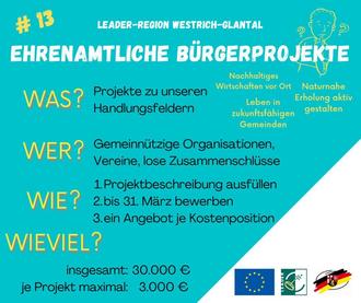 Noch bis zum 31. März 2023 können sich Vereine und Initiativen für eine Förderung bei der LEADER-Region Westrich-Glantal bewerben. Mit insgesamt 30.000 € können Projekte aus den Verbandsgemeinden Bruchmühlbach-Miesau, Landstuhl, Oberes Glantal und Ramstein-Miesenbach unterstützt werden.