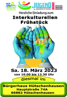 Am Samstag, 18. März, findet unser „Interkulturelles Frühstück“ von 10.00 bis 12.30 Uhr im Bürgerhaus Hütschenhausen statt. Hierzu laden wir einheimische und zugereiste Familien sowie Interessierte ganz herzlich ein.