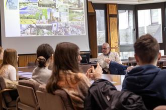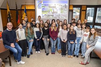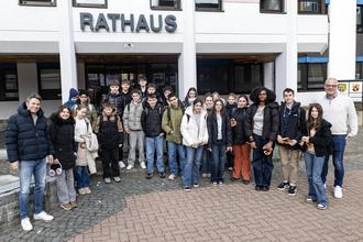 Der Bürgermeister hatte sichtlich Vergnügen an dem regen Austausch mit den jungen Leuten. Die Schülerinnen und Schüler hörten ihrerseits aufmerksam und sehr genau zu, was Herr Hechler so alles erzählte. Am Ende bedankten sich die beiden Lehrer und die Schüler für die interessante Stunde im Rathaus und auch Bürgermeister Hechler dankte für den Besuch und lobte die gute Vorbereitung und die muntere Fragerunde: „Ich freue mich immer über Besuch von jungen Leuten und über gute Ideen, die von ihnen eingebracht werden.“