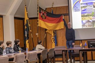 Was halten Sie vom Wahlrecht ab 16 Jahren? Was verdienen Sie als Bürgermeister? Hat sich das Verhältnis mit den Amerikanern verändert? Diese und viele weitere Fragen musste Bürgermeister Ralf Hechler beim Besuch zweier Klassen der 8. Jahrgangsstufe vom Ramsteiner Reichswald-Gymnasium beantworten. Gemeinsam mit ihren Lehrern Alexis Wächter und Matthias Nixdorf wurde der Sozialkunde-Unterricht vergangene Woche in den Sitzungssaal des Rathauses verlegt. Bürgermeister Hechler zeigte zunächst eine Präsentation über die Stadt und die Verbandsgemeinde Ramstein-Miesenbach bevor er sich den zahlreichen Fragen der Schülerinnen und Schüler stellte.