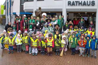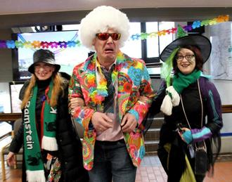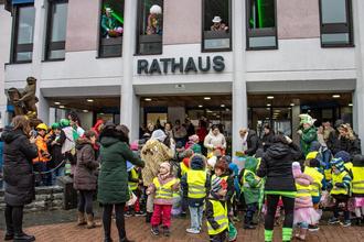 Zahlreiche Jungs und Mädchen der Ramsteiner Kindertagesstätten „Pinocchio“, „Struwwelpeter“ und St. Nikolaus sowie vom Niedermohrer „Sterntaler“ trotzten dem Regen und schauten sich das Spektakel vor dem Rathaus an. Dafür ließen Bürgermeister und Beigeordnete Süßigkeiten aus dem Fenster des Rathauses regnen, die von den Kinder eifrig eingesammelt wurden. Bei kalten Getränken, Brezeln und Fastnachtskiechelscher im Foyer des Rathauses schloss man am Ende wieder Frieden und die Hexen zogen auf der Suche nach weiteren Männern mit Krawatten weiter.