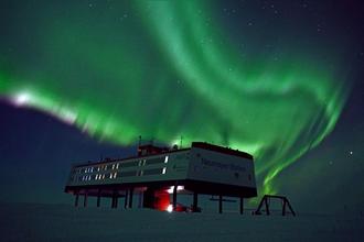 Die Neumayer-Station III in der Antarktis mit Polarlichtern (Bild: Thomas Hoffmann)