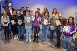 Die neun Schulsieger mit den Jurymitgliedern sowie (2. Reihe v.l.) Bürgermeister Ralf Hechler, Büchereileiterin Michelle Müller und Kreisbeigeordneter Peter Schmidt. Vorne in der Mitte die Siegerin Antonia Kartarius (Foto: Stefan Layes).