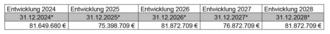Der Stand des Eigenkapitals betrug zum 31.12.2023 72.771.239 € und wird sich planmäßig wie folgt entwickeln: