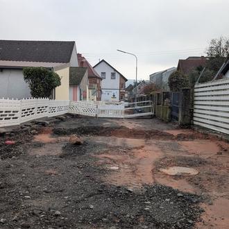 In der Bachstraße sind die Leitungsarbeiten inzwischen weit fortgeschritten. Die neue Straßenbeleuchtung wurde bereits Mitte Februar in Betrieb genommen. Ein Großteil der Hausanschlüsse, insbesondere im südlichen Bereich, ist wieder verfüllt.