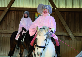 Um 14.30 Uhr startete die Märchenvorführung mit Pferden. Diesmal ging es um einen Schäfer, der einen Zauberstab fand und versuchte zu zaubern. Jedes Mal zauberte es etwas völlig anderes als gewünscht. Statt Weihnachtsgänse kamen Prinzessinnen, statt Rentiere für den Nikolaus Zebras, die von den Eseln gespielt wurden. Statt des Weihnachtskarpfen tauchten Piraten auf, statt der Prinzen für den Weihnachtsball lauter Frösche, statt Weihnachtswichtel kam ein Drache, statt weißer Mäuse tauchten lauter rosa Elefanten auf und der Weihnachtsengel wurde zu Pegasus, einem Pferd mit Flügeln. Nur der letzte Zauberspruch, ein Weihnachtsfest in der Eulenmühle funktionierte schließlich.