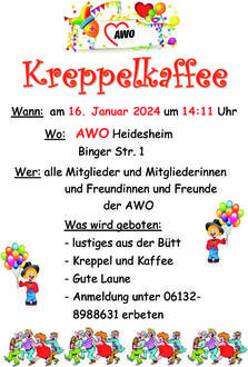 Wir laden herzlich ein zum närrischen Kreppelkaffee am 16.1.2024 in die AWO Begegnungsstätte Heidesheim. Beginn: 14.11 Uhr. Eintritt frei, um Anmeldung zwecks Planung wird gebeten. Helau.