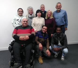 hintere Reihe (v.l.n.r.): Carlos Pereira, Dr. Silvia Klengel, Zhypar Maiymbetova-Steiner, Stefan Weitzel, Tatyana Vester, Minas Ioannidis, vordere Reihe (v.l.n.r.): Mannan Amou, Ahmad Shakib Saboor, Abdirahman Khadar, Bild: Stadt Ingelheim.
