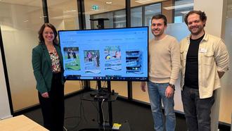 Bürgermeisterin Eveline Breyer stellt mit den Mitarbeitern des Sportamtes Noah Schönel und Johannes Sonntag die neue Homepage des Sport- und Freizeitparks vor.