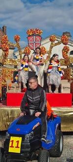 Los ging es am Abend mit dem Kostümball, bei dem alle Gruppen ihre Kostüme präsentierten und viel Zeit zum Tanzen blieb. Nach dem Gottesdienst am nächsten Morgen, bei dem die Majestäten die Fürbitten hielten, ging es weiter mit dem Höhepunkt - dem Festumzug. Auf einem eigenen prunkvollen Festwagen wurden Luna, Amelie und Natalie zwei Runden durch die Straßen von Auxonne gefahren, die dank des tollen Wetters, gesäumt mit feiernden Zuschauern waren. Von den Konfetti-Massen finden die drei bestimmt noch lange etwas in ihrer Kleidung.