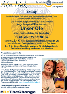 Katja Lange-Müller kommt auf ihrer Lesereise nach Ingelheim, um ein Herzensanliegen der hiesigen Soroptimistinnen zu unterstützen: die Prävention der Genitalbeschneidung von Frauen und Mädchen.