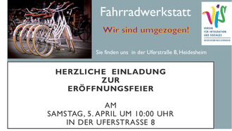 Sehr herzlich laden wir am Samstag, 5. April um 10:00 Uhr zur Eröffnung unserer neuen Werkstatt in die Uferstraße 8 ein! Bei dieser Gelegenheit werden wir auch auf das 10-jährige Bestehen der Fahrradwerkstatt mit einem Glas Sekt anstoßen! Die Feier findet in unserer neuen Bleibe in der Uferstraße 8 statt! Wir freuen uns auf Ihr Kommen!