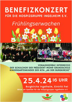 Die Hospizgruppe Ingelheim e.V. freut sich sehr über dieses besondere Benefizkonzert, das bestimmt ein Lächeln auf alle Gesichter zaubern wird: Der Schulchor der Präsident-Mohr-Schule und Kinder aus dem Kindergarten an der Burgkirche singen gemeinsam mit dem Männervokalensemble „Intermezzo“ in der Ingelheimer Burgkirche Frühlingslieder.