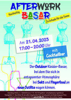 Vorbeikommen, anprobieren und sich wohl fühlen! Das ist auch in diesem Jahr die Devise des After-Work-Basars. Im Sinne der Nachhaltigkeit wollen wir so abgelegten, gut erhaltenen Kleidungsstücken neues Leben einhauchen.