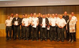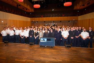 alle geehrten, beförderten, ernannten und entpflichteten Mitglieder der Feuerwehr Ingelheim mit Dezernentin Dr. Christiane Döll (Mitte)