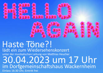 unter diesem Motto lädt Haste Töne?! zum Wiedersehenskonzert am 30.04.23 um 17 Uhr im Dorfgemeinschaftshaus in Wackernheim ein.