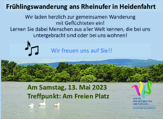 Am Samstag, dem 13. Mai laden wir wieder zur Frühlungswanderung ans Rheinufer in Heidenfahrt ein. Alle können teilnehmen! Kommen Sie mit Ihren Familien und wandern Sie mit uns! Nehmen Sie dabei Kontakt mit Geflüchteten auf und genießen Sie die wunderschöne Natur! Am Rheinufer werden wir im Biergarten eine Stärkung zu uns nehmen und die Gespräche fortsetzen. Gerne können Sie auch einfach zu uns dazustoßen. Wir werden gegen 11:30 Uhr dort am Rheinufer sein!