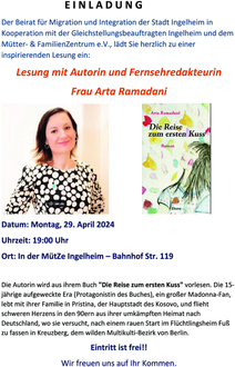 Der Beirat für Migration und Integration (BMI) der Stadt Ingelheim lädt in Kooperation mit der städtischen Gleichstellungsbeauftragten und dem Mütter- und Familienzentrum MütZe e.V. herzlich zu einer inspirierenden Lesung mit Arta Ramadani ein. Die Autorin liest am Montag, 29. April 2024, um 19 Uhr in den Räumlichkeiten des MütZe, Bahnhofstraße 119.