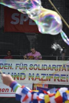 „Ingelheim ist bunt und nicht braun. Wir stehen für Vielfalt, für Frieden und für Solidarität“, fasste der Vorsitzende des Vereins Rheinhessen gegen Rechts e. V. nach der Demonstration am 1. Mai zusammen. Über 400 Menschen folgten dem Aufruf des Ingelheimer Bündnis gegen Rassismus und Gewalt In-RAGE e. V., Rheinhessen gegen Rechts e. V., dem DGB, der SPD und den Grünen. Auch der rheinland-pfälzische Staatsminister Alexander Schweitzer, die Bundestagsabgeordnete Tabea Rößner und der Ingelheimer Oberbürgermeister Ralf Claus beteiligten sich an dem Protest. Für musikalische Unterstützung sorgte Roland Schäfer, Vorsitzender des Vereins.