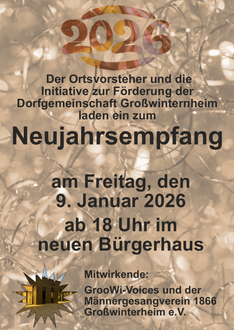 Der Ortsvorsteher Christian Fürst sowie die Chefin der Initiative der Dorfgemeinschaft Groß-Winternheim Roswitha Grün laden herzlich ein zum Neujahrsempgang 2026 am Freitag, 09.01.2026 ab 18:00 Uhr im Bürgerhaus, Oberhofstraße 19 mit Weck, Worrscht und Woi.