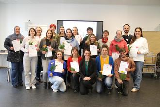 Mitte Dezember gratulierte Bürgermeisterin Eveline Breyer 17 städtischen Mitarbeiterinnen und Mitarbeitern zum erfolgreichen Abschluss des Kurses auf Basis des Landesfortbildungscurriculums „Mit Kindern im Gespräch“. Die Qualifizierung, die zur Übernahme der Aufgaben als Sprachbeauftragte befähigt, umfasste 60 Unterrichtseinheiten und wurde von der Volkshochschule im Weiterbildungszentrum Ingelheim durchgeführt. Teilgenommen haben engagierte Erzieherinnen und Erzieher aus städtischen Kitas und Horten. In einer Austauschrunde hob die Bürgermeisterin die Rolle der Kita als modernen Bildungsort hervor, an dem Lernen durch und mit Sprache grundlegend verankert ist.
