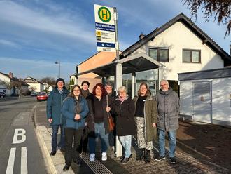 Stefan Leiner (hintere Reihe links) Beigeordnete Dr. Christiane Döll (vorne links) eröffnen gemeinsam mit weiteren Vorstandsmitgliedern und Beteiligten das neue Schild an der Bushaltestelle.