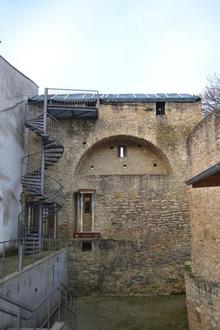 Die Abdeckung mit einer Schutzplane während des letzten Winters und Stützkonstruktionen zeugen von den notwendigen Sicherungsarbeiten an der staufischen Wehrmauer, Bild: Stadt Ingelheim