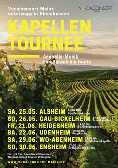 Dazu öffnen sechs Kapellen und kleine Kirchen Rheinhessens im Mai und Juni ihre Türen für Liebhaber*innen des Acapella-Gesangs – zu beschwinglichen bis nachdenklichen Momenten mit dem Ensemble. In den variierenden Konzertprogrammen stehen Acapella-Werke aus Barock bis heute. Die ausgewählten Kapellen und Kirchlein abseits der urbanen Zentren knüpfen zwischen Heidesheim im Norden und Worms-Abenheim im Süden in diesem Frühsommer ein kulturelles Netz.