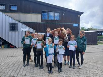 Von links nach rechts und von vorne nach hinten: Joy Metzler, Lara Kotzian, Marlene Metter, Ninja Bach, Emma Kandzia, Amelie Goliasch, Thea Grüger, Lara Huf mit den Ausbildern Barbara Huf und Natali Kurth. Ganz hinten: Schulpferd