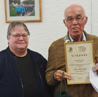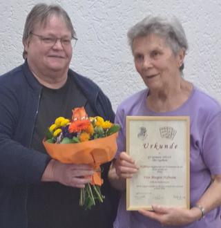 Bildunterschrift: Für 50 Jahre Vereinstreue überreichte Vorsitzende Monika Reble Ehrenurkunden an Margret Hofmann und Willi Sprenger.