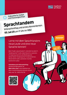 Am Montag, 3. Juli 2023, um 17 Uhr findet im WBZ, Fridtjof-Nansen-Platz 3, ein Sprachtandemtreffen statt, bei dem sich Sprachtandems bilden oder Interessierte sich informieren können. Außerdem gibt es alle Informationen auf der städtischen Internetseite unter www.ingelheim.de/leben-freizeit/integration/sprache-lernen.