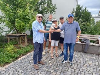 Aus diesem Anlass überreichte Jochen mit Unterstützung von Ilona den französischen Freund*innen eine historische Boulekugel, die Walter Schleuß dem Verein kultur+politik vor Jahren übergab. Die Kugel ist noch aus Holz und mit vielen Nägeln beschlagen, sodass sie stählern erscheint. Dieses wertvolle Stück übergab Herr Schleuß in zwei Exemplaren, sodass wir noch eines in Obhut behalten und in Ehre pflegen.