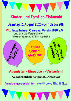 Schnäppchenjäger aufgepasst – im Rahmen des Sommerfests des ICV findet am Samstag, 02.08.2025 von 15:00 Uhr bis 20:00 Uhr rund um die Vereinshalle in der Westerhausstraße 17 in Ingelheim ein Flohmarkt ausschließlich für private Anbieter statt.