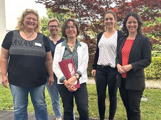 Andrea Schmitt (Personalrat), Isabell Heinze (Leiterin der Mediathek), Ursula Budjan, Jutta Lager (Abteilungsleitung) und Bürgermeisterin Eveline Breyer