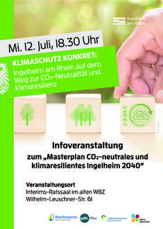 Die Stadt Ingelheim am Rhein lädt am Mittwoch, 12. Juli 2023, von 18.30 bis 21 Uhr alle interessierten Bürger*innen herzlich zu einer kostenlosen Infoveranstaltung zum Masterplan CO2-neutrales und klimaresilientes Ingelheim 2040 ein. Der Masterplan und die Aktivitäten der Stadt werden vorgestellt und diskutiert. Mit dabei sind Oberbürgermeister Ralf Claus und Beigeordnete Dr. Christiane Döll, Vertreter*innen der Energieagentur sowie der städtischen Gesellschaften. Organisiert wird die Veranstaltung von der KlimaWerkstatt der Stadt Ingelheim am Rhein.