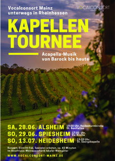Mit dem Konzertformat "Kapellentournee" stießen die sechs Sängerinnen und Sänger des Vocalconsorts Mainz im vergangenen Jahr auf ein begeistertes Publikum: Hier war das Ensemble in besonderen Kapellen im rheinhessischen Land unterwegs. Intime, moderierte Programme von Barock bis heute präsentiert das Vokalensemble auch in diesem Sommer. "Für die Zuhörerinnen und Zuhörer, aber auch für uns sind die Konzerte in den Kapellen und kleinen Kirchlein besonders intime Momente der Musik", schwärmt Bariton Niklas Wawrzyniak.