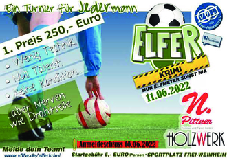 Der VfL bedankt sich für die zahlreiche Teilnahme, tolle Stimmung und bei allen Helfern. Wir hoffen, dass der Elferkrimi wie auch in früheren Jahren wieder zu einem festen Ereignis im Weinumer Veranstaltungskalender wird!